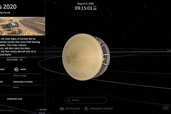 通過NASA新提供的在線工具(https://mars.nasa.gov/mars2020/timeline/cruise/),人們隨時可以看到毅力號旅行的情況,包括沿途經過的天體、衛星、彗星、路線說明等。點擊任何天體,能閱讀關於這個天體更詳細的信息。