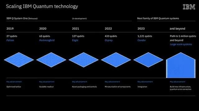 9 月 15 日,IBM 首次公布其量子計算機未來幾年的路線圖,預計 2023 年,會實現 1121 比特的量子系統 Condor。並認為,在未來十年,能夠實現容錯量子計算機。