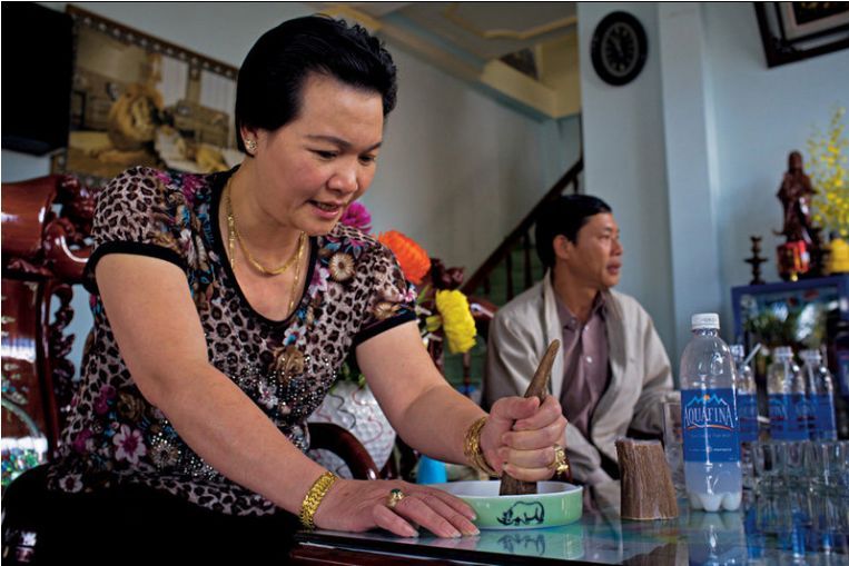 △ 一位越南婦女正在咖啡館裡研磨犀牛角,當地人相信,這是一種超級維生素,可以治百病。圖源Brent