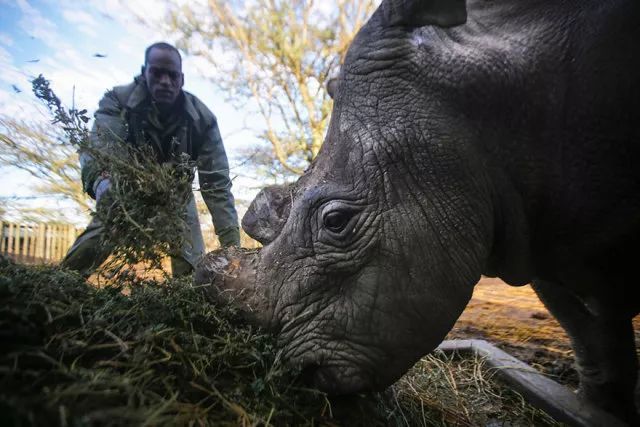 如果沒有它的“保安團”時刻陪伴,蘇丹也可能會遭到毒手。為了保護蘇丹和它的家人,保護區的工作人員只得先行割去它們的角。去世前,蘇丹以“最後一隻雄性北白犀”的身份,頻頻出現在鏡頭前。當人們不無緊迫感地講述著它行將滅絕的明日時,蘇丹卻只會眨著黑亮的眼睛,偶爾瞧瞧人,更多時候安靜地吃草。