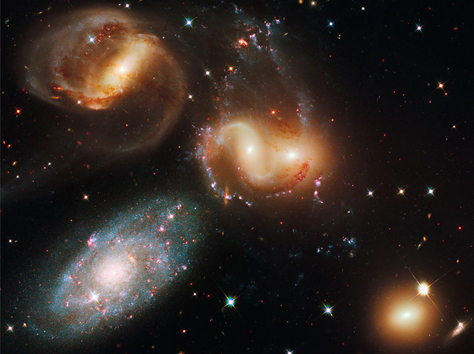 上圖是賽弗特六重星系,其實這個結果的成員正兒八經的只有四個,有一個已經被其他星系通過引力拉的解體來。還有一個就是正面朝向我們的那個星系,看起來非常小,原因是它相比於其他星系距離我們非常遠,至少是其他星系五倍的距離。但是這個星系看起來也具有詳細的細節,而且我們在其中也觀察到了具有時間膨脹效應的事件。不可否認,光傳播的時候是會與星際介質發生作用,損失能力,但其微小程度可以忽略,它更不能稱為解釋星系光譜紅移的原因。更加否認不了宇宙空間在膨脹的事實,也更加無法撼動以愛因斯坦廣義相對論為基礎的新宇宙學模型。所以說,星光的紅移還必須得用多普勒-菲索效應來解釋!