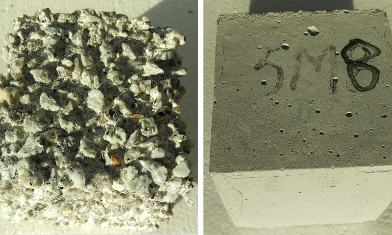 ▲ 左邊是被嚴重腐蝕的普通波特蘭水泥(Portland Cement)混凝土,右邊則是零水泥混凝土。