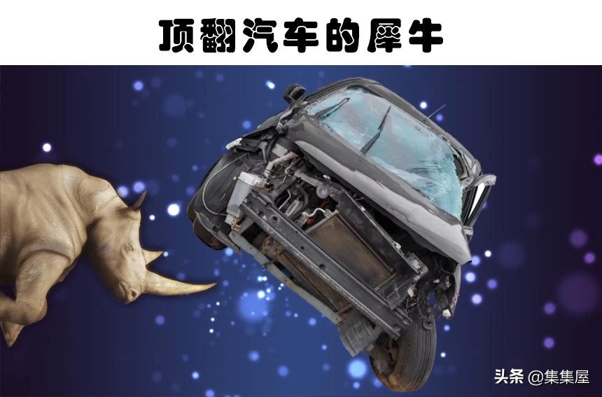 2017年的一天傍晚,結束聚會後,肯尼亞女子切波塞特·阿多莫行走在回家的路上。但在她沒有意識到的是一條1.9米長的黑曼巴蛇在她的腳裸盤繞的時候,她就被咬了一口。但災難還沒有結束,在她身旁還有兩隻黑曼巴蛇,而她腳上的蛇反覆咬了她好幾口。就在這個危急時刻,有一名路人出現,並使用砍刀砍了兩條蛇,最終拯救了她。在嘗試使用傳統藥物後,他們將她放在摩托車上,將她運送了45分鐘到最近的一家抗蛇毒血清醫院。萬幸的是,在遭遇了擁有劇毒的黑曼巴蛇咬傷之後,她最終倖存了下來。5、頂翻汽車的犀牛