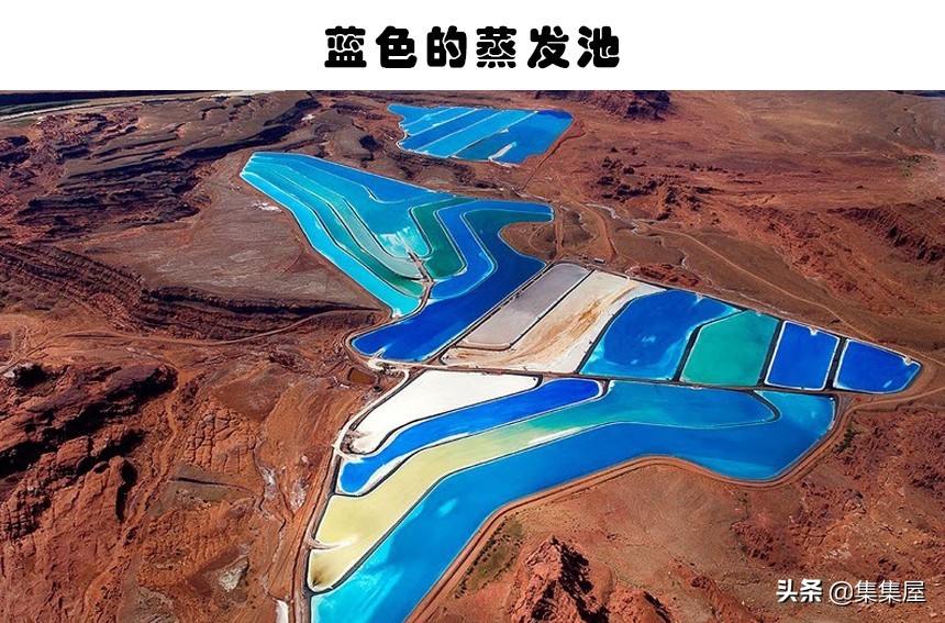 在美國猶他州貧瘠的荒漠中央,有一片看起來非常奇特、美麗的藍色池塘。雖然它看起來非常的完美,但是卻很危險。因為它們實際上是碳酸鉀蒸發池,由美國最大的氯化鉀生產商無畏鉀肥公司管理。這些奇形怪狀的藍色池塘與周圍貧瘠、紅色的荒漠形成了鮮明的對比,這種顏色對於吸收陽光和蒸發提供了最佳的幫助。當太陽把池塘裡的水蒸發掉的時候,鉀和鹽的結晶被留了下來,這些結晶會被收集起來用於生產化學物質。
