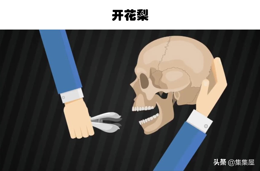 開花梨這種刑罰不會立即造成死亡,但會導致嚴重的疼痛,並且通常會因受傷而導致死亡的速度減慢。據說,這種梨形的裝置被用來懲罰那些說話不合時宜的人,這種刑具會被放入犯人的口中,然後它將被向外移動,並迫使其嘴巴張開。8、抽除腳筋