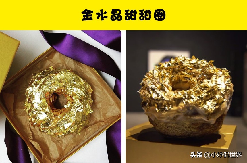 這款奶昔含有大量極盡奢華的成分,它們可以說是100美元的純正奢侈品。在其成分中,我們可以找到澤西島牛奶、大溪地的香草冰淇淋、英格蘭的奶油、馬達加斯加的香草,以及23克拉的黃金,並用Le Cremose Baldizzone(驢焦糖醬)調味,最後還抹上馬拉斯加櫻桃酒中的櫻桃。它還被放在用施華洛世奇水晶裝飾的玻璃杯中。這款飲品還獲得了世界上“最昂貴的奶昔” 的吉尼斯世界紀錄稱號。3、金水晶甜甜圈