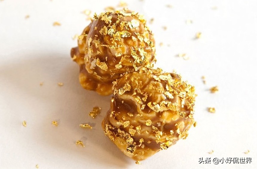 這款名為“Golden Cristal Ube”的甜點一打售價1200美元,單個需要100美元,是世界上最昂貴的甜甜圈。製作甜甜圈的麵糰和糖霜中含有大量的Cristal香檳,甜甜圈上還塗上了一層閃閃發光的24克拉金色外衣,並用精心放置的金箔封口,整個過程需要廚師執行近兩個小時。創作者是邁阿密馬尼拉社會俱樂部的菲律賓廚師Bjorn DelaCruz。4、金色爆米花