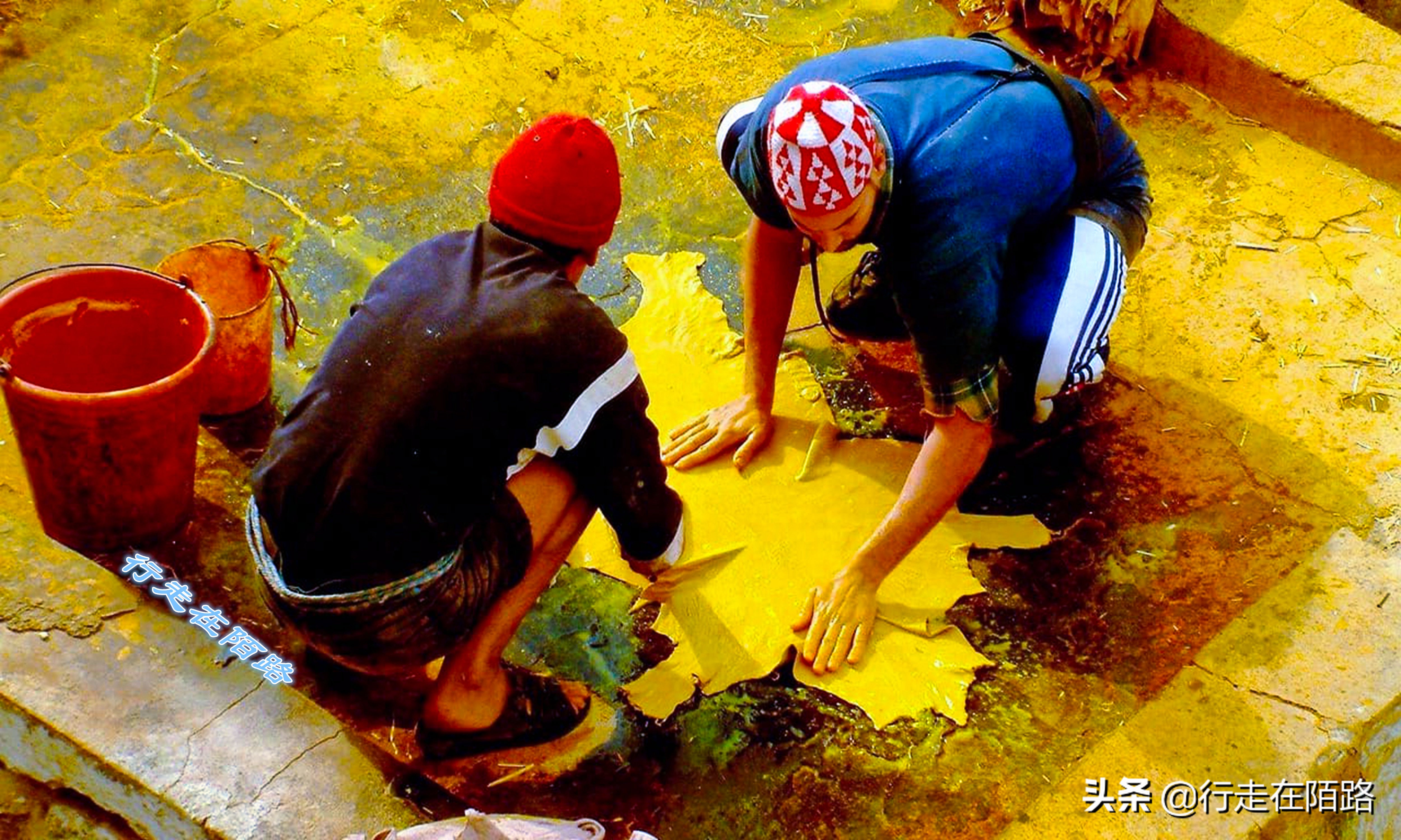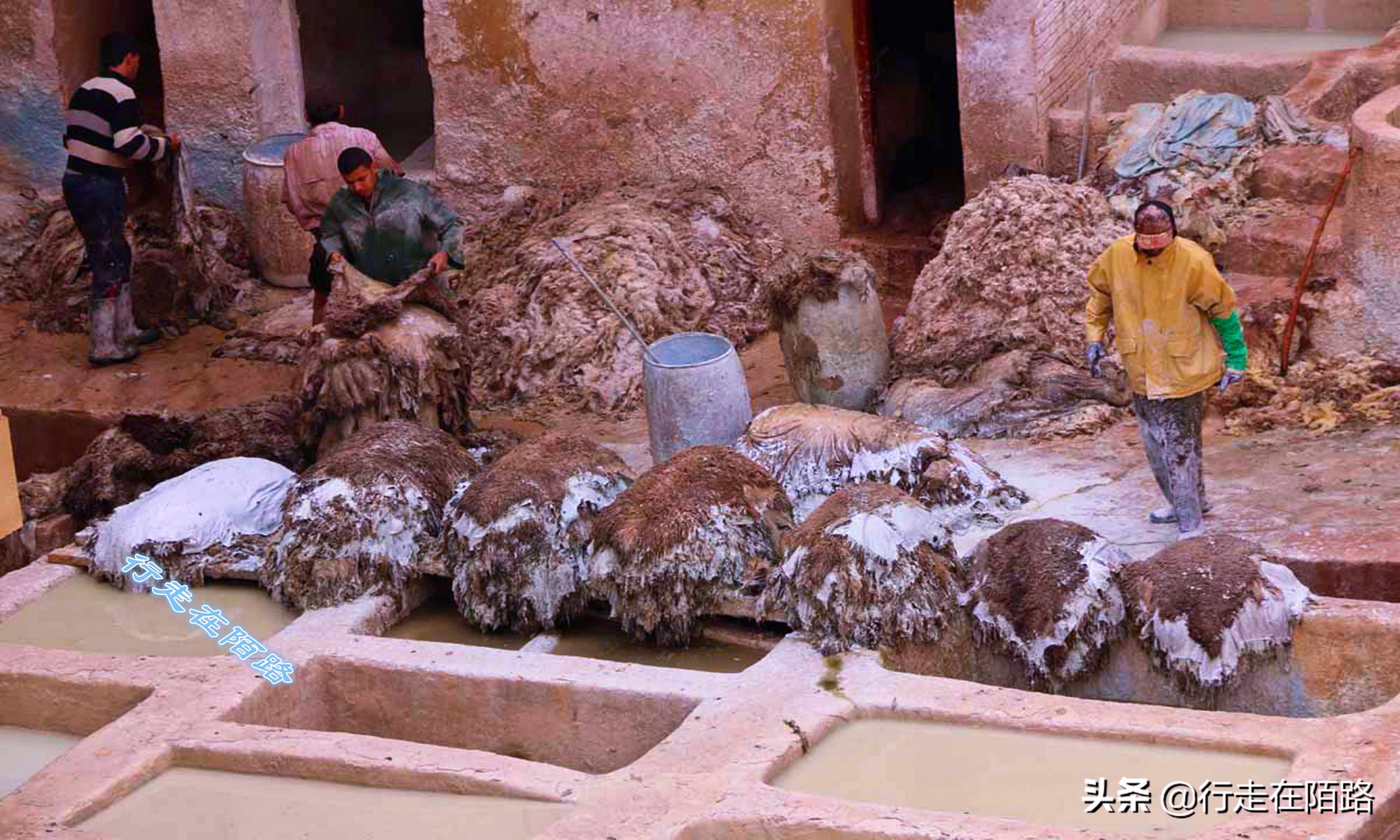進廠後的皮革先放在水池中反覆浸泡清洗,直到去除所有肉眼可見的毛髮後再次暴曬,待水分徹底蒸發後才用進入第二步,也就是用牛尿、生石灰、鹽等材料混合成的天然著色劑浸泡,而牛尿與其他材料會合成類似嫩膚劑一樣的成分,使皮革更加柔軟光滑。由於是純手工製作,所有材料的混合都需要長時間攪拌以使之充分合成,這也是菲斯製革廠都是露天的主要原因,真的是臭氣熏天。