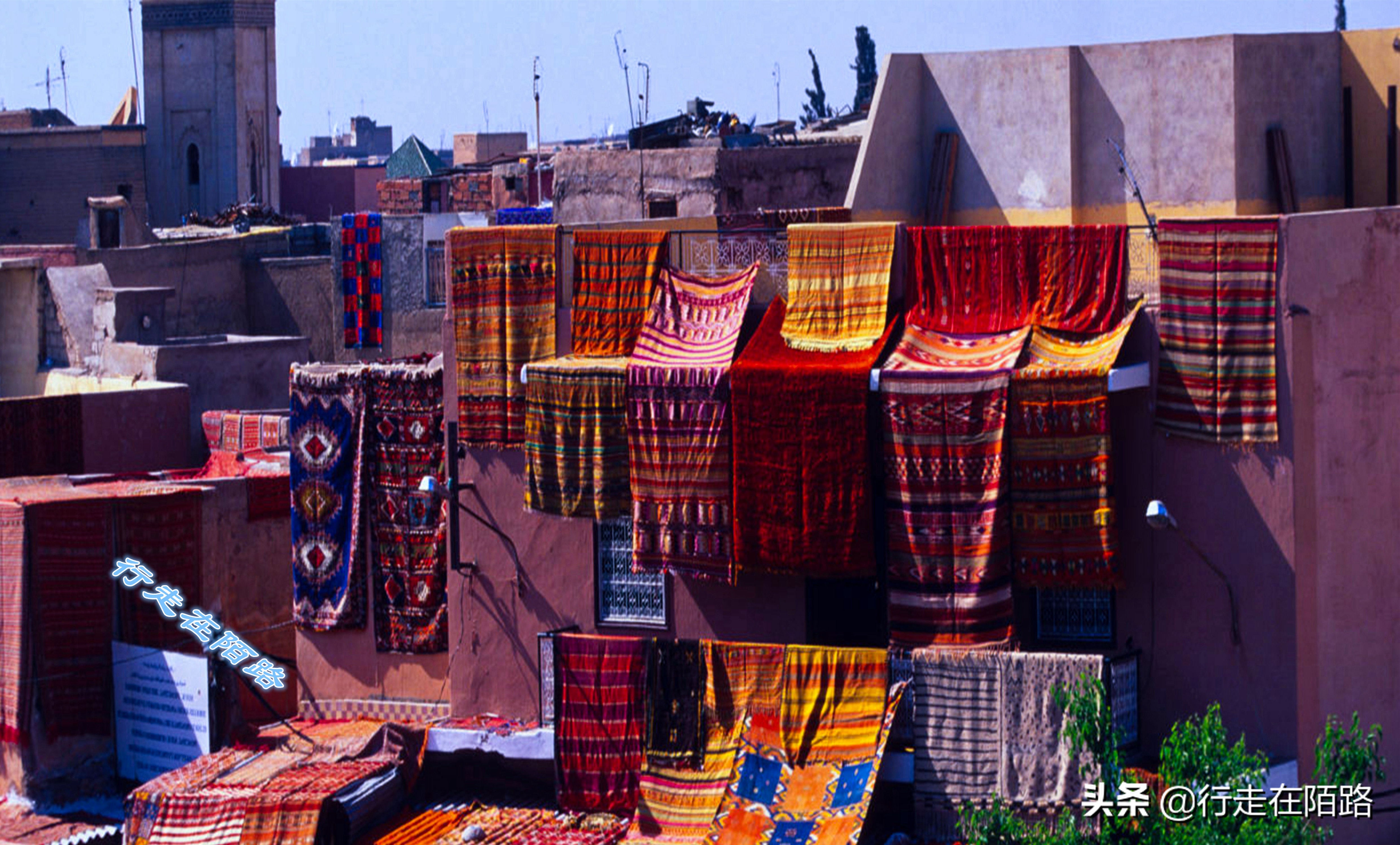 菲斯另一大行業是紡織品,雖說工藝沒有伊朗那麼精湛,但勝在使用天然染料和棉紡布,以及極具阿拉伯文化的各種圖案,在國際市場上的受歡迎程度也不低。《摩洛哥多元文化》一書有詳細記載,菲斯棉紡業的歷史比皮革還要早遠,公元40年羅馬帝國攻佔摩洛哥後曾大力推廣紡織業,此後又被融入阿拉伯工藝,具備快捷、成品率高等特性。所以,幾乎每個菲斯女性都會織布染紡,家家戶戶都掛著各式染布晾曬。