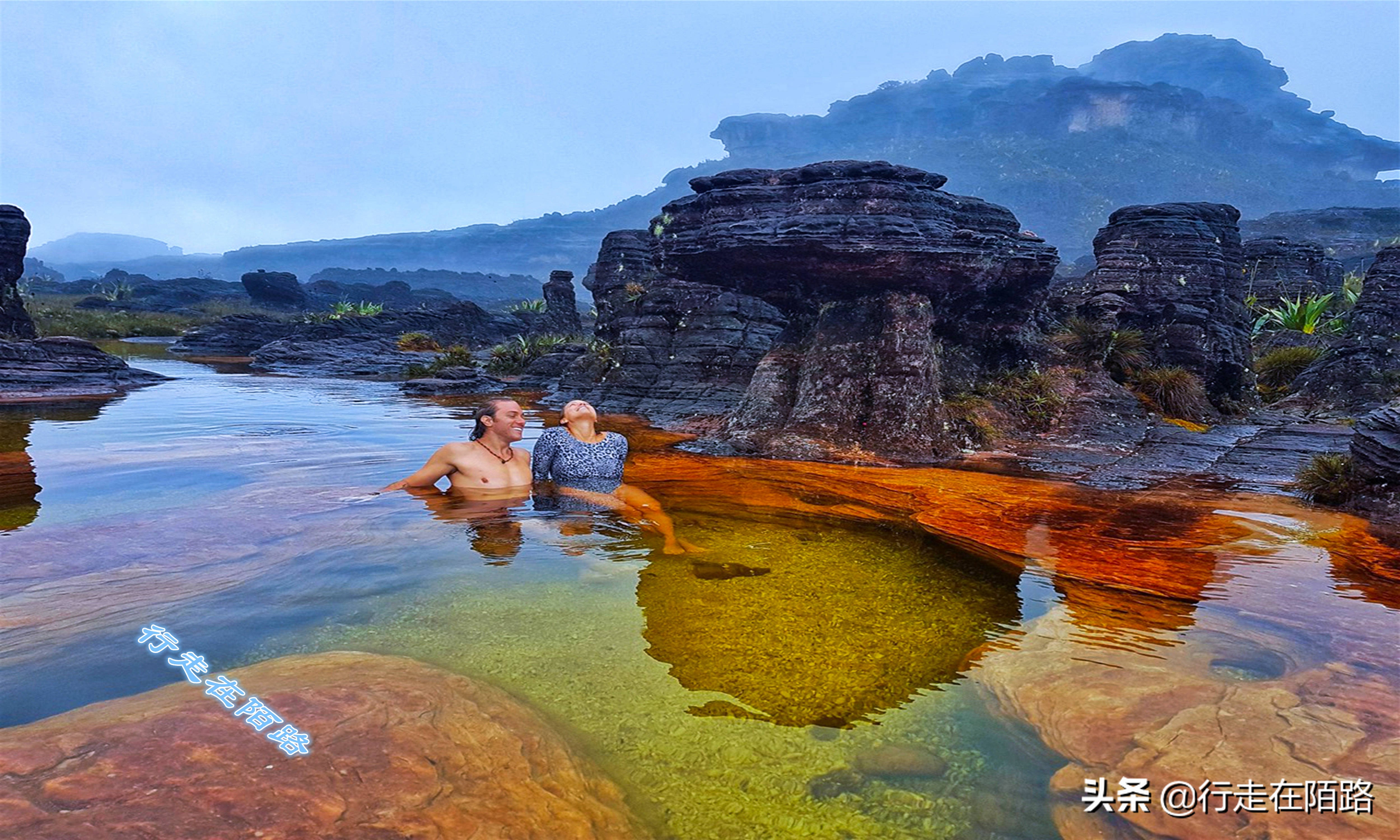第二個營地在特普伊山對面的羅斯山,距離約10公里,由於營地角度測斜看不到天使瀑布,但能聽到明顯的瀑布轟隆聲。之所以選擇在羅斯山,是因為山上有很多天然溫泉池,原本高溫的溫泉水從山頂流到營地後早已冷卻,因而成為遊客點名要體驗的地方。確實,經過半天長途跋涉再泡泡冷泉水,解暑又解乏。