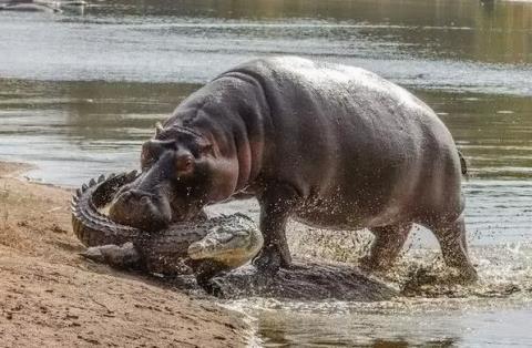 第八張是被河馬攻擊的鱷魚,河馬和鱷魚都是非洲河流流域中最為兇猛的動物,而當河馬碰上鱷魚河馬,一旦被激怒,就會展現其超高的攻擊力,鱷魚也不是他的對手,鱷魚被他叼在嘴中當做玩具一樣甩來甩去。