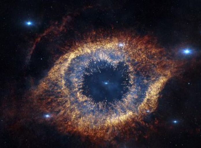 一個個的球狀星團,都是恆星系統崩潰分裂的鐵證。除此之外,還有一小部分星系內的恆星簇被發現,雖然它們質量很低,相較於星系外部數量明顯減少,這個發現與之前的理論沒有差別。與上帝之臉相似的還有被稱為上帝之眼的NGC1086螺旋星雲,它距離我們也有六千萬光年,亮度非常高。這個星雲不同於上帝之臉的碰撞形成,這是由一顆位於水瓶座中央的昏暗恆星吹的氣和塵埃形成的外殼,恆星核心遺骸注定會是白矮星,發射的輻射具有很高能量,使之前射出的雲氣發光。