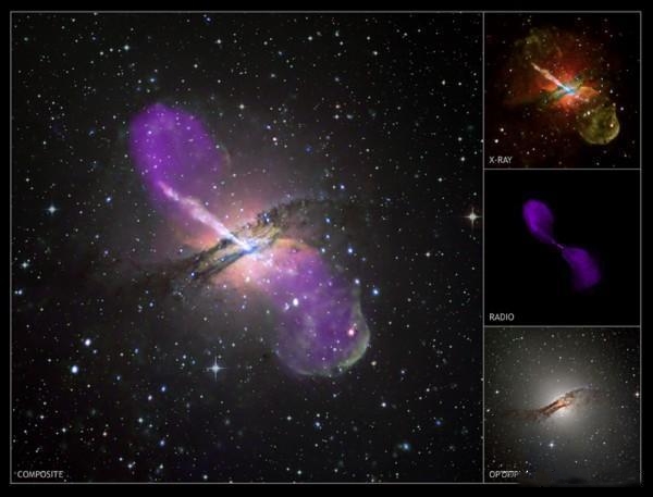 上圖就是M87星系中心的射電源,能夠延伸數十萬光年,但我們並沒有看到黑洞的身影。還有下圖這樣的,在不同的波段下,我們依然能看見星系中心的物質噴流。