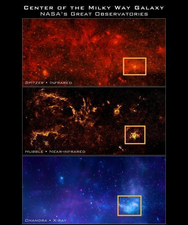 上圖是我們通過斯皮策、哈勃、錢德拉三個望遠鏡在紅外線、近紅外線、X射線波段下對銀河系中心的觀測結果,可以看出黃色方框中的區域比任何地方都要明亮。這其中肯定有不一樣的東西存在。