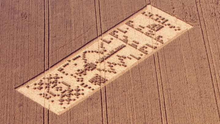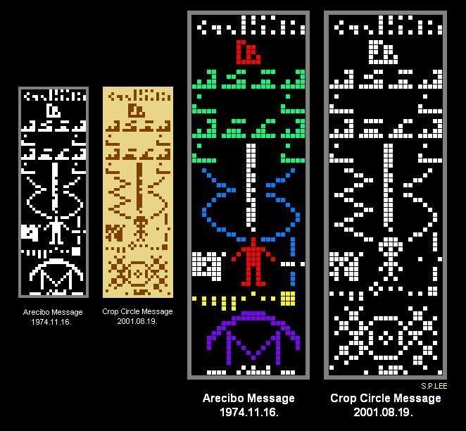 有趣的是,2001年人們在英國漢普郡奇爾波頓射電望遠鏡附近的麥田裡發現了一個怪圈,差不多就是阿雷西博訊息的複製品,只是裡面的碳元素被改成了矽,DNA也被改寫,人類外形則變成了一個有著球狀頭顱的矮人。這個麥田怪圈被認為是外星人對阿雷西博訊息的回覆,預示著這個星球的外星人是矽基生命,當然,這只是一個惡作劇。