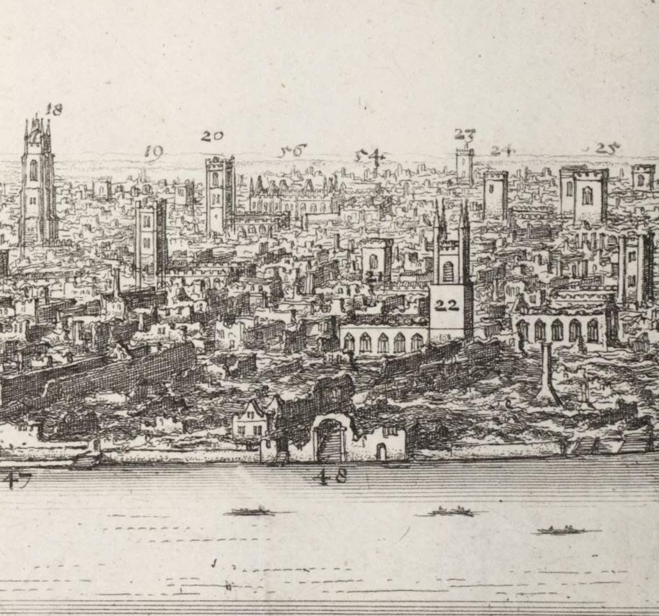 這場大火燒燬了13000多座房屋、87座教區教堂以及皇家交易所和聖保羅大教堂等紀念建築。總的來說,這場火災造成的損失估計有1000萬英鎊,與這座城市的年收入估計為1.2萬英鎊相比,這是一個驚人的數字。
