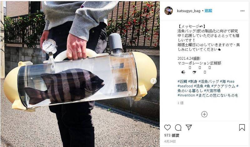 IG帳號「katsugyo_bag」上傳數張照片,只見一名男性手持橢圓圓柱體,柱身透明,上頭還有類似二氧化碳錶的設備;仔細一看,柱體內灌滿了水,還有一隻隻活魚,特殊又新奇的畫面讓人看了相當訝異,原來,這是開發來裝運活魚的物品「活魚袋」。