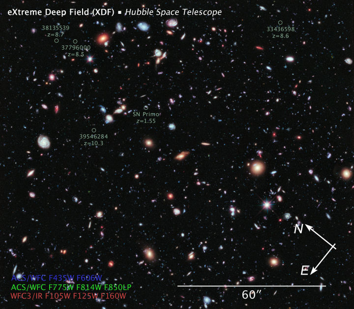 而根據哈勃深空場(哈勃望遠鏡分別在1995年、2003年和2012年對極為遙遠的宇宙深處拍攝的照片)顯示的星系密度,以及整個天區推算出來的天體密度,那麼天文學家就可以根據這些資料,計算出宇宙背景亮度!