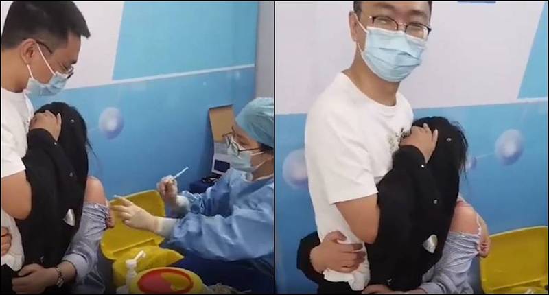 中國1名潘姓女上班族在醫護站前緊抱著男同事不放,只要醫護人員拿著裝有疫苗針筒靠近她,她就會放聲尖叫,讓醫護人員好無奈,只好等女子情緒平復後再替她施打;女子事後指出,「本來去的時候就很害怕、很害怕」,一時無法克服心中的恐懼。