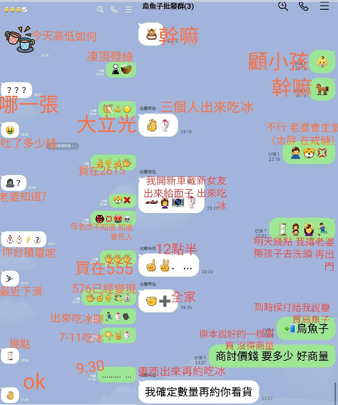 就當眾人以為原PO會發生家庭革命時,原PO今上午又貼出「翻譯內容」,原來老公是和朋友訴苦股票「凍頂殘綠」,「大力拍打、肌肉、陽光」符號代表股王「大立光」,「公雞、閃電」符號為「台積電」,但因擔心原PO得知虧損會生氣,因此特別用暗號與朋友討論,甚至還用「冰淇淋」符號偷約朋友吃冰,因為之前才被原PO下令禁止吃冰。