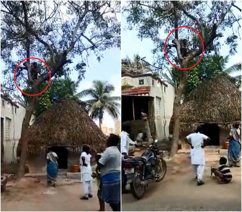 印度邦狄哲利的基礎醫療人員,近日正挨家挨戶走訪民宅,為上次疫苗接種活動中,沒施打到的人補打,孰料39歲男子多維爾(Muthuvel),一見到醫護工作者,就爬到樹上。
