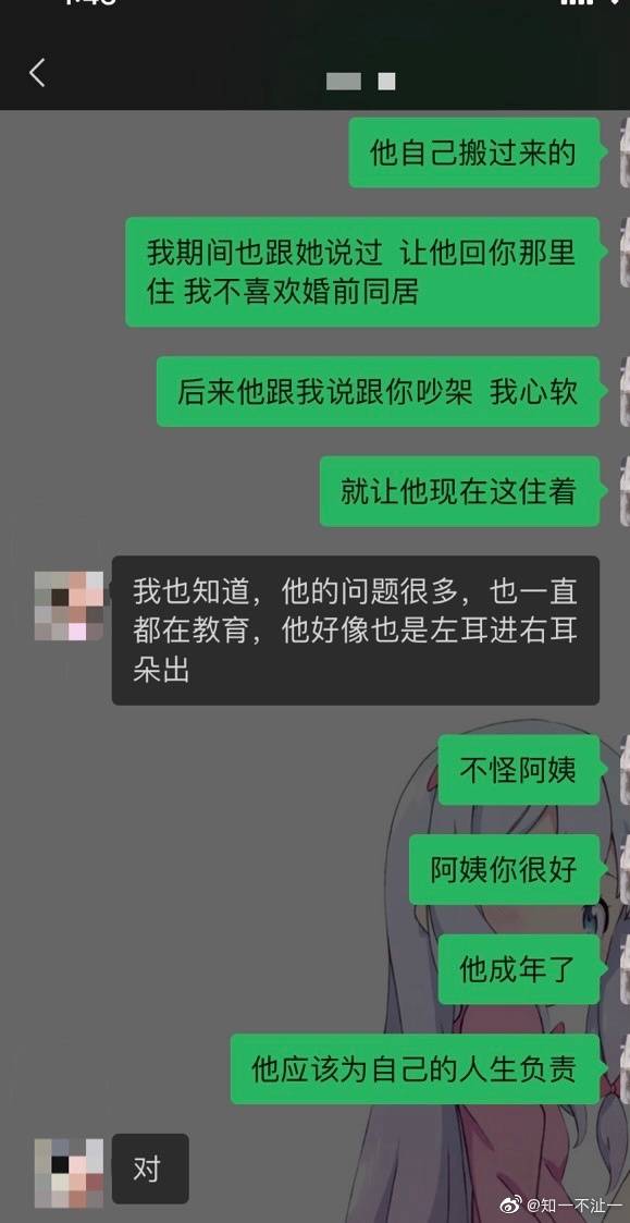 有中國網友批事件女主角「白嫖」還公審,她反曬出與摳門男母親的對話截圖為自己反駁。(翻攝微博)