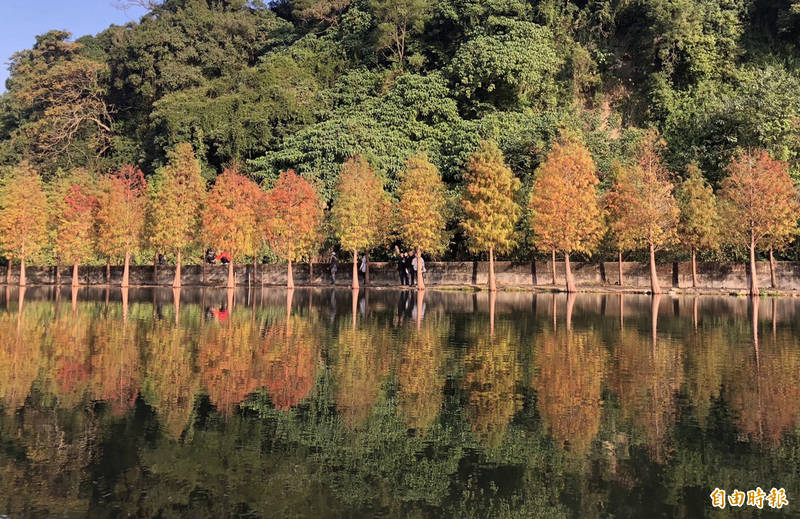 大溪月眉人工濕地生態公園的落羽松葉子逐漸轉紅,搭配生態池倒影相當美麗。(記者李容萍攝)