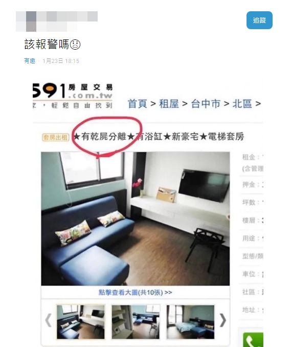 一名網友23日在匿名論壇「Dcard」上分享一張在知名租屋網上看到的訊息,可以看到台中市北區一位房東正在出租套房,宣稱該物件是新豪宅、有附浴缸、電梯等,不過最讓人感到毛骨悚然的是,該套房還有「乾屍分離」,讓原PO驚呆詢問:「該報警嗎?」