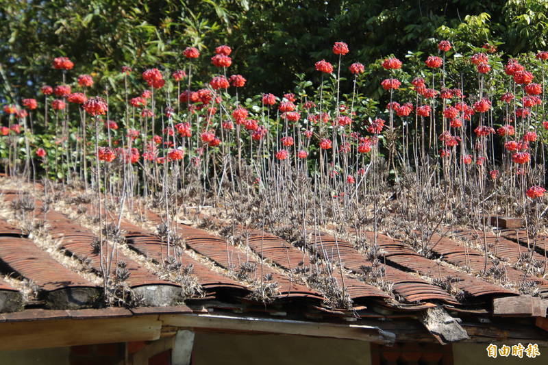 難得一見、長在紅瓦上的棒葉落地生根開花場景引人駐足。(記者黃美珠攝)