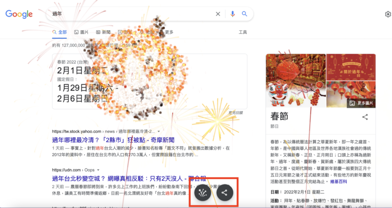 就要過新年了,為了迎接虎年 Google 這次也特地在搜尋關鍵字時,如果輸入與新年相關的詞彙,例如「春節」、「過年」、「農曆新年」等,在搜尋結果出現後,畫面上會出現煙火特效,在特效煙火施放的過程中,還會出現老虎的頭型。