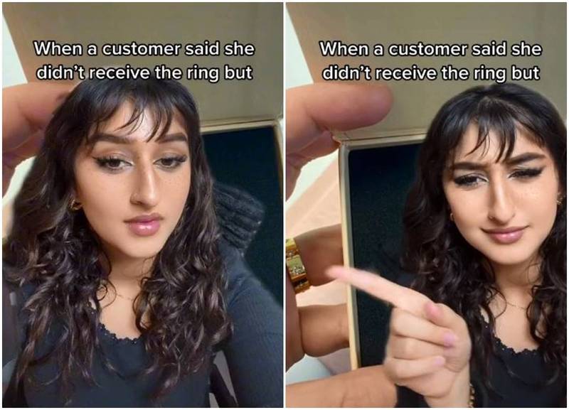 祖拜爾提及,通常只有1個商品訂單不會遺漏,因此初步推測運送過程中發生意外,並要求這名客戶拍照以示證明;未料她收到客人回傳的照片卻傻了,因為這名顧客手上戴著該枚18K金戒指,並手持「空包裹」拍照。