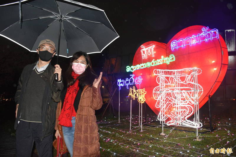 設在平鎮新勢公園的「手護真心」燈組,是情侶逛桃園燈會必拍的燈組。(記者李容萍攝)