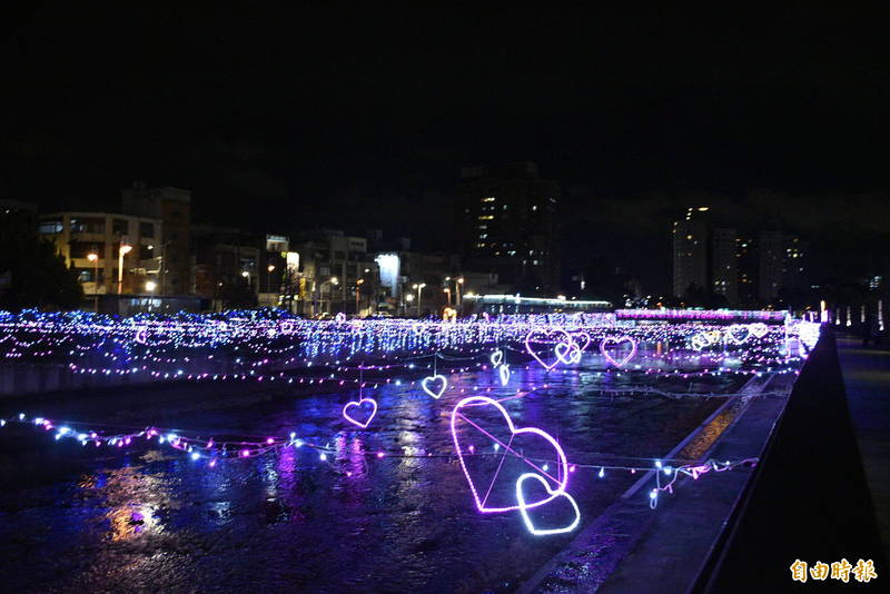 桃園燈會設在老街溪沿岸的「四季紅」燈組,滿滿放閃的愛心。(記者李容萍攝)