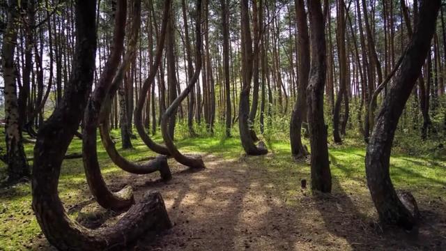 所有的樹木底部都有一個相同的向北90度的彎曲,它被稱為彎曲森林。這個奇特的地方至今仍然是一個無法解釋的謎。儘管彎曲森林所有的樹木都長得很高,但每棵樹都有一個相同的環繞區域,且似乎沒有被它們的c形曲線所影響。