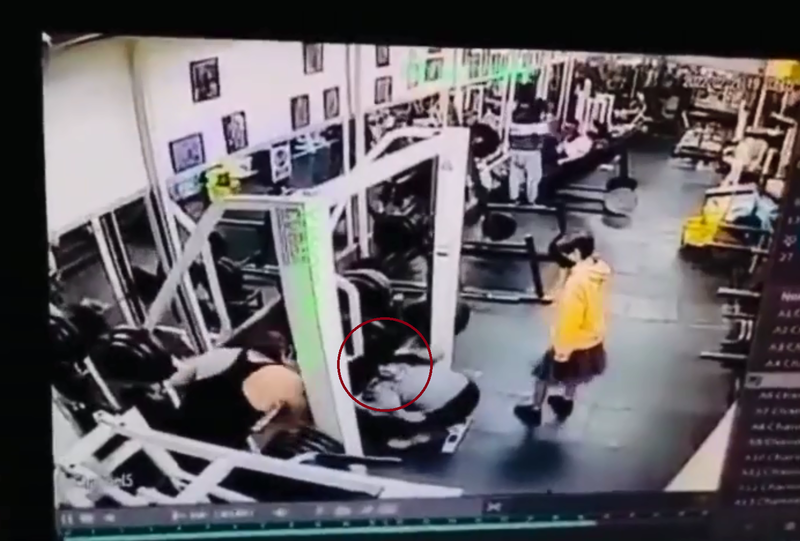 監視畫面顯示,女子左方站了一名穿著黑背心的男子,似乎在幫忙調整槓鈴的重量,而她的後方,則有穿著黃色外套的女員工待命,當目擊女子試舉失敗,遭到槓鈴壓脖,卡死在重訓椅時,所有工作人員趕緊衝上前救援。