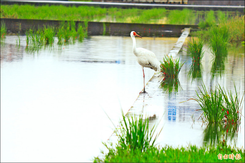 宜蘭市西伯利亞白鶴,被發現左腳受傷,走路一跛一跛。(記者林敬倫攝)