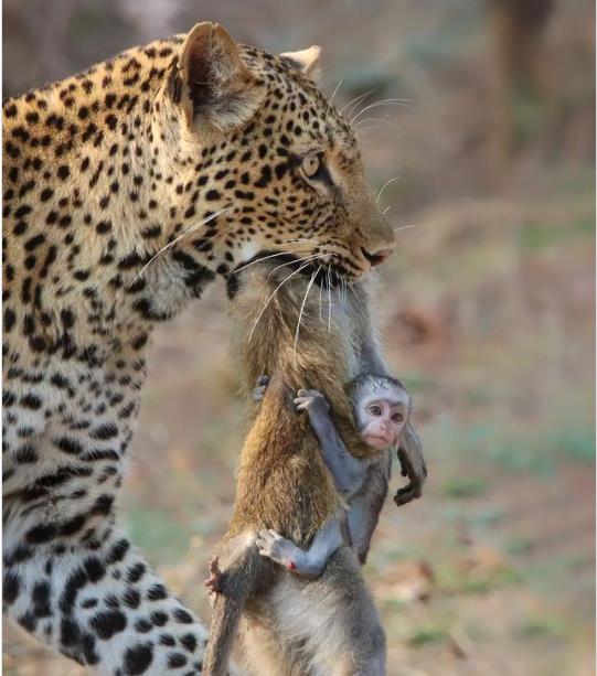 而母猴被花豹獵捕時,小猴子似乎也在旁邊,看到母親被叼走後,牠連忙跟上去,甚至抓著媽媽的屍體不放,由於牠年紀還小,不知道花豹是掠食者,也並未意識到母猴已死去,因此一起被花豹帶走,抵達豹群地盤後,小猴子最終也被花豹的幼崽吃下肚。雖然這一張照片去年就被分享至社群媒體,但近日又引發關注。