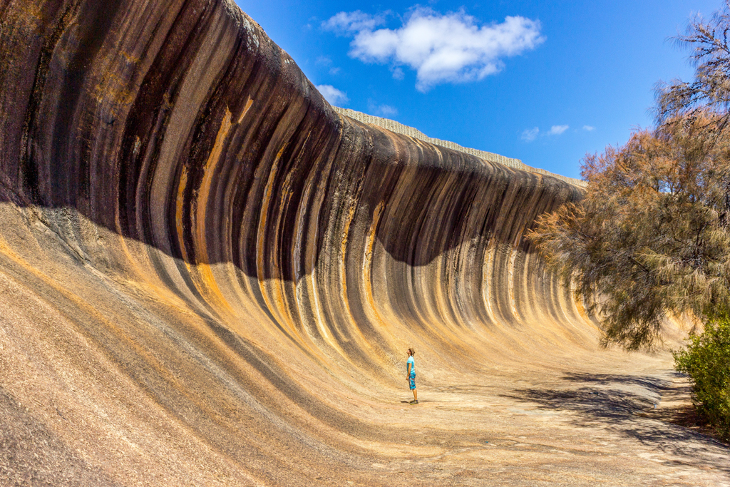 這片長約100公尺、高15公尺的「海浪」其實是由岩石所組成,位於澳洲第四大城市柏斯(Perth)東南約340公里處,因為外觀跟海浪相似,所以被取名為「波浪岩」(Wave Rock),夾雜著大量藻類,在夏季或乾燥的氣候時會呈現暗色紋理,視覺上看起來更加生動。