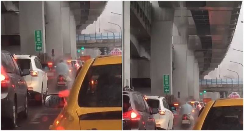 近期連日降下大雨,不少民眾選擇開車外出,一名網友分享了一段影片,可見1名騎士剛好停在高架橋排水孔下,出現如「瀑布下修煉」的一幕,令原Po笑稱「武學奇才」,瞬間引來大批網友熱議。