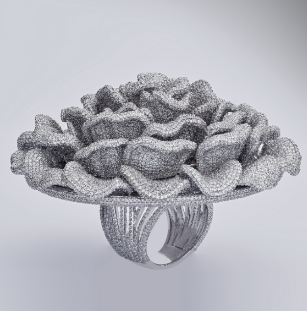 SWA Diamonds透過電腦輔助設計並3D列印出模具,再將液態黃金倒入其中塑形,最終完成41片連為一體的獨特的蘑菇瓣,並在每一瓣上鑲嵌鑽石,指環上的大部分地方也有鑲鑽,只有最底部沒有。