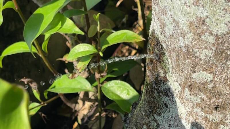 蕭坤誠說,這株肉桂樹種了15年,外觀看似無奇,細瞧樹根往上約30公分的地方,樹幹上竟然有個小洞,1個星期以來不停的從小洞冒出水柱,老婆見飼養貓咪常常會跑到樹下喝水,意外發現這個奇觀,左右鄰居和附近民宿住客聽聞後好奇跑來觀看,有人甚至開玩笑說可以裝水龍頭了。