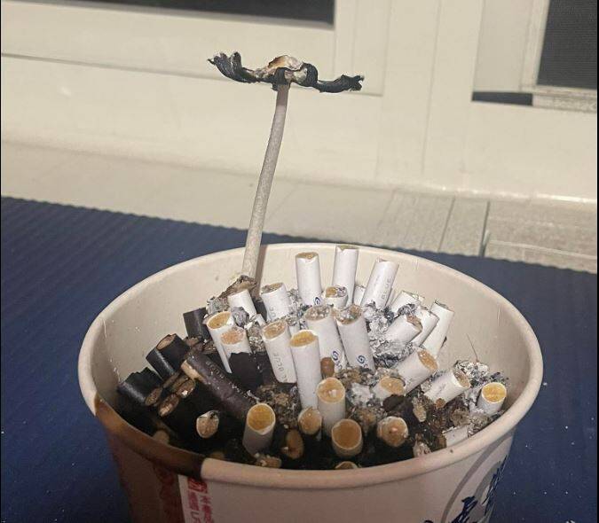 該網友在臉書PO出照片,可以看到照片中有朵黑灰色的香菇生長在一個外帶紙碗做成的菸灰缸內,它一開始菌傘還沒張開,接著下張照片則是這朵奇妙的香菇菌傘完全張開,原PO在貼文中表示「下班到家,走進陽台要抽煙被這香菇嚇到了,上班前還沒有這東西,還以為是老婆惡作劇插在上面的。更:這香菇真的很嚇人欸…看個電視一小時去看,它竟然開屏了」