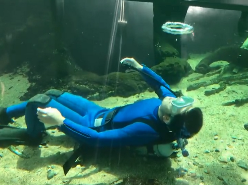 受到保育野生動物等觀念影響,現今越來越少海洋哺乳類被迫圈養在水族館內,也因為沒了這些人氣動物吸引觀光客,水族館只好用使用其他法繼續經營,而日本就有間水族館竟突發奇想,派出「真工讀生」到水族箱內,模仿白鯨表演吐泡泡!
