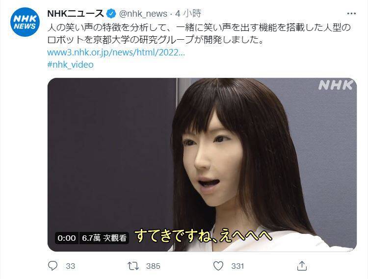 京都大學情報學研究院的研究小組開發出能「有說有笑」的人形機器人,利用AI人工智慧分析人類笑聲的頻率、音量還有語氣等多種因素,判斷笑聲的種類,再依此發出不同的笑聲配合聊天。