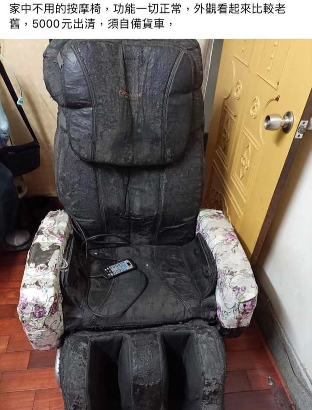 一名男子在臉書發文,並上傳1張照片,照片中有台歷經風霜,遭閒置在一旁的黑色按摩椅,按摩椅上的黑色皮革不僅斑駁,還有大面積破碎、脫落,實在是有些慘不忍睹;而圖片中也有文字寫著「家中不用的按摩椅,功能一切正常,外觀看起來比較老舊,5000元出清,需自備貨車」。