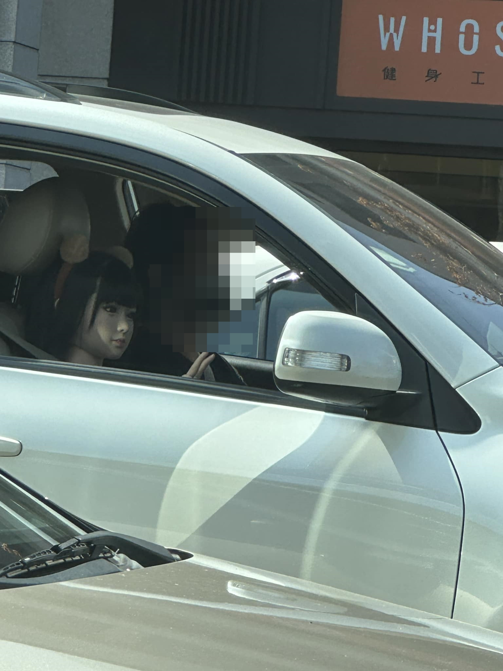 有網友在臉書分享照片,一名駕駛行駛在路上被路人目擊副駕駛座位上放著一具真人比例大小的「假人玩偶」,該具玩偶戴著毛茸茸的髮飾,一頭黑秀髮與齊瀏海,身高與男駕駛差了半顆頭,還疑似比出「YA」的手勢,讓目擊者發文說「突然看有點嚇到…」。