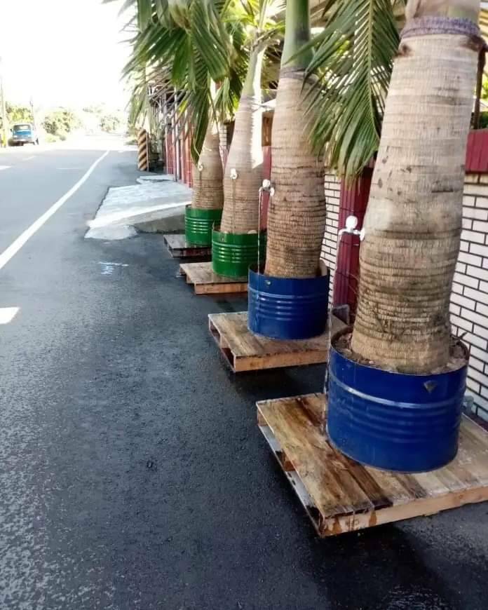 陳男表示,父親有一天將山上的椰子樹鋸掉4棵運下山,先是移植種在鐵桶裡,接著拉水管穿過椰子樹,並且裝上水龍頭,也能直接供給樹木水分,更能綠美化住家環境,一舉兩得。