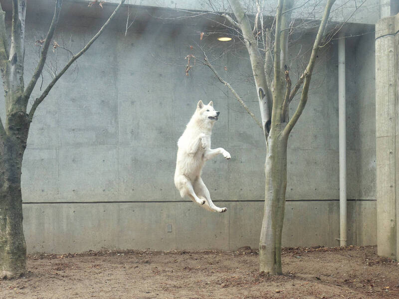 日本網友@garou_wolfphoto在推特上分享日前到秋田市大森山動物園所拍下的照片,畫面中整個房間內並沒有任何人以或是其他動物,但畫面中的北極狼整個身體卻懸在半空中,有如被外力吸引。