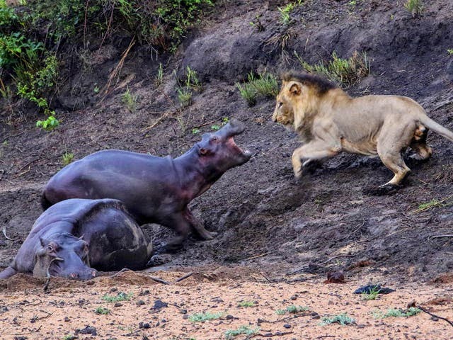 國外攝影師Hanno Erasmus過去曾在南非克魯格國家公園(Kruger National Park)拍到珍貴的一幕,畫面中可見,一隻母河馬疑似因為受傷,深陷泥淖之中無法動彈,因此被一旁的公獅子盯上,一口咬上母河馬,小河馬見狀後絲毫不怯戰,竟不顧自身安危,挺身對著獅子不斷凶狠咆哮。