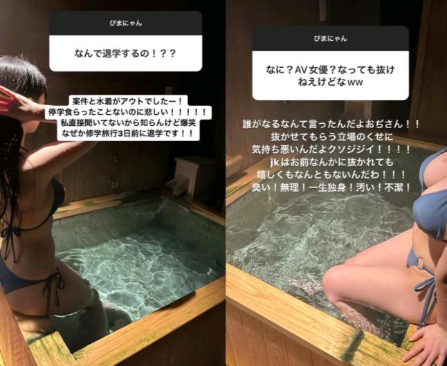原PO將此事分享至網路,提到由於自己上傳內衣照,因此無法參加戶外教學,感到非常難過,她最終以「自願退學」的方式離校,所以也無法參加最後的考試,未來她將轉校至較彈性的「通信制」高中,學生以自學為主,可透過網路上課,不必每天到學校。